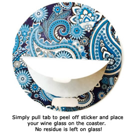 the user of the wine glass. Simply peel off the top paper exposing the adhesive and place the wine glass on top. The adhesive will hold the coaster on the glass and can be discarded after your event is concluded.
